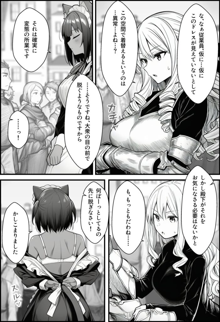 負けん気の強い、戦好きのワガママ王女様が仕立て屋の口八丁にまんまと乗せられて、広場に現れた時の権力の象徴である豪奢な西洋甲冑姿から下着姿、全裸と、段階的に乙女が他人に決して見せてはいけない秘部を晒していく過程が堪りません♡